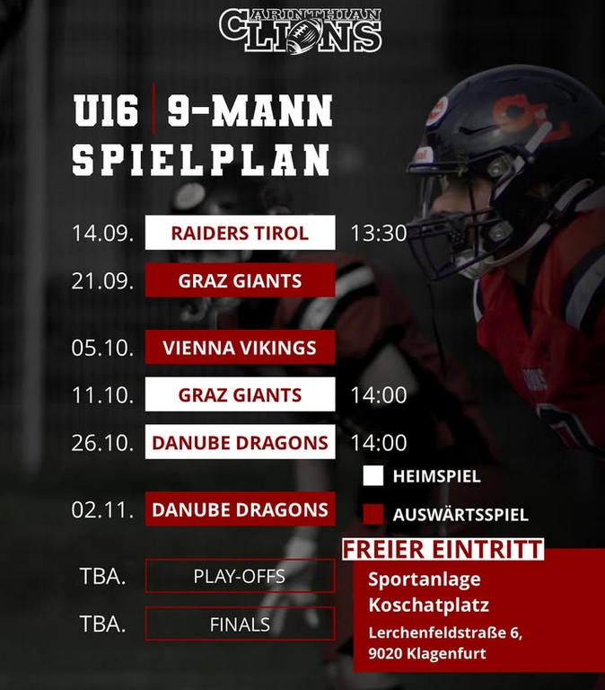 Keine zwei Wochen mehr und unsere Löwen melden sich aus der Sommerpause zurück! Zum Auftakt der U16 9 Mann Football Saison treffen unsere Jungs am 14.09. um 13:30 daheim auf die U16 der Swarco Raiders Tirol.